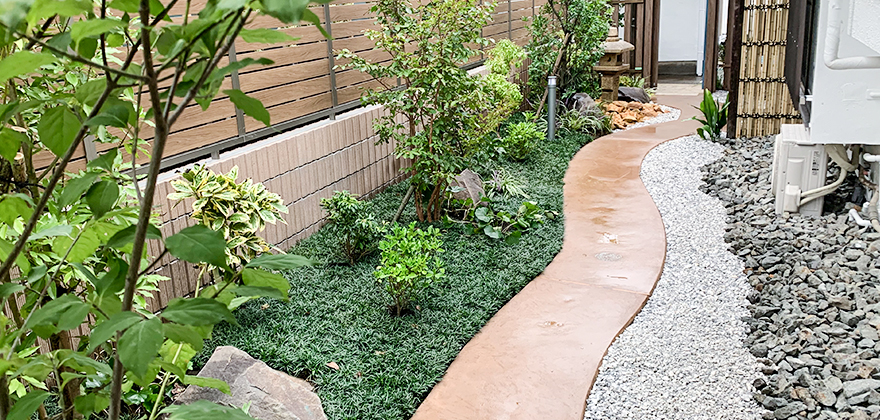 玄関までの歩行動線を石材・タイル・洗い出しなどで美しく整備。勾配や排水にも配慮した安全で快適な通路を提案。