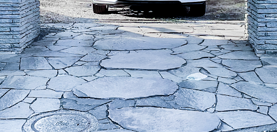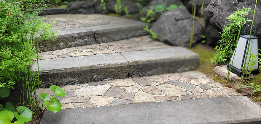 自然石舗装・真砂土舗装・インターロッキングなど、用途に応じた路面仕上げ。滑りにくさと美観を両立。